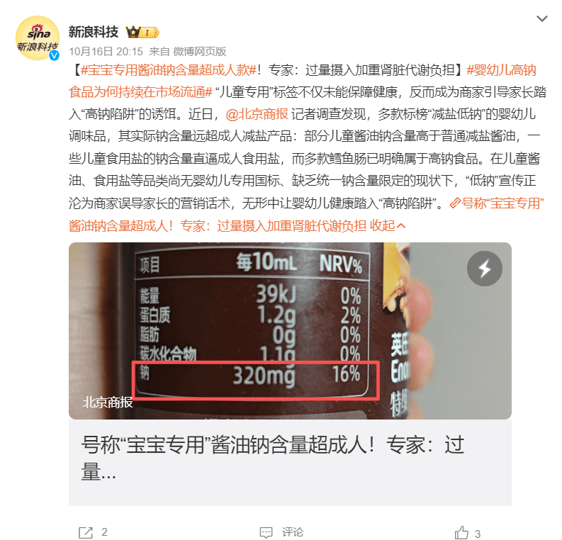 本年10月,据《商报》报道,多款宝宝酱油钠含量跨越款,此中爷爷的农场旗下的产物——无机松茸酱油(减盐型)每10毫升钠含量达409毫克,被发觉高于未标注儿童公用的千禾产物。