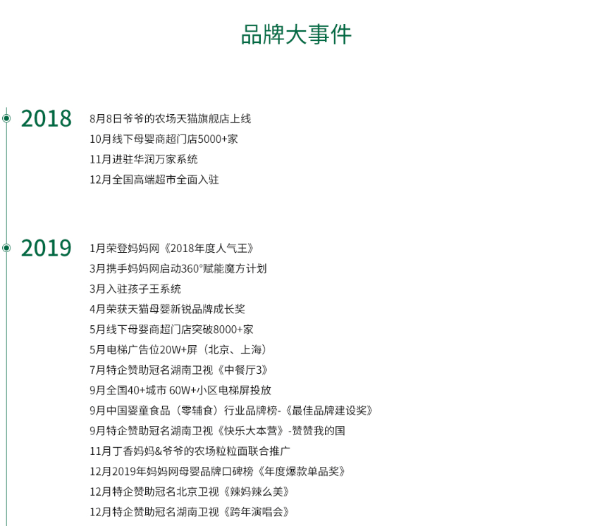 爷爷的农场号称原产欧洲的天然婴长儿食物品牌,凭仗“进口”的卖点,敏捷打开销。官网显示,仅用2个月时间,爷爷的农场进入中国5000+家线个月时间,进驻华润万家系统;4个月,入驻全国高端超市。不到一年,爷爷的农场就入驻孩子王系统、进入了8000+家线下母婴商超门店,正式正在食物母婴行业坐稳脚跟。